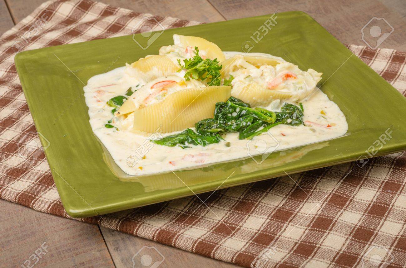 Stuffed Pasta Shells With Crab Alfredo Filling Stock Photo